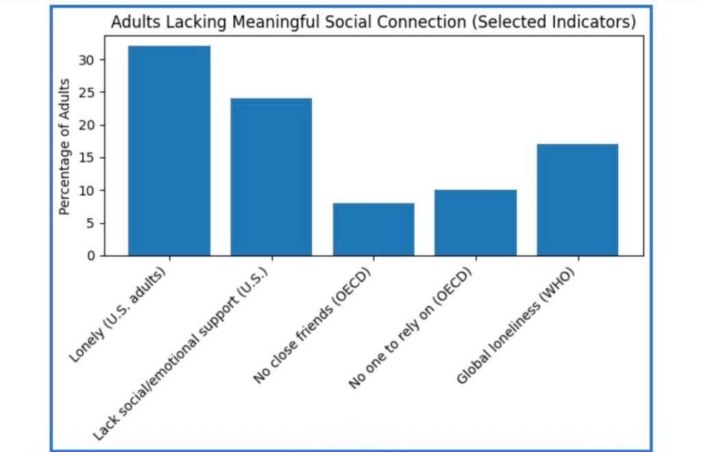 Nearly 1 in 3 U.S. and 1 in 6 people adults globally (World Health Organization) report loneliness